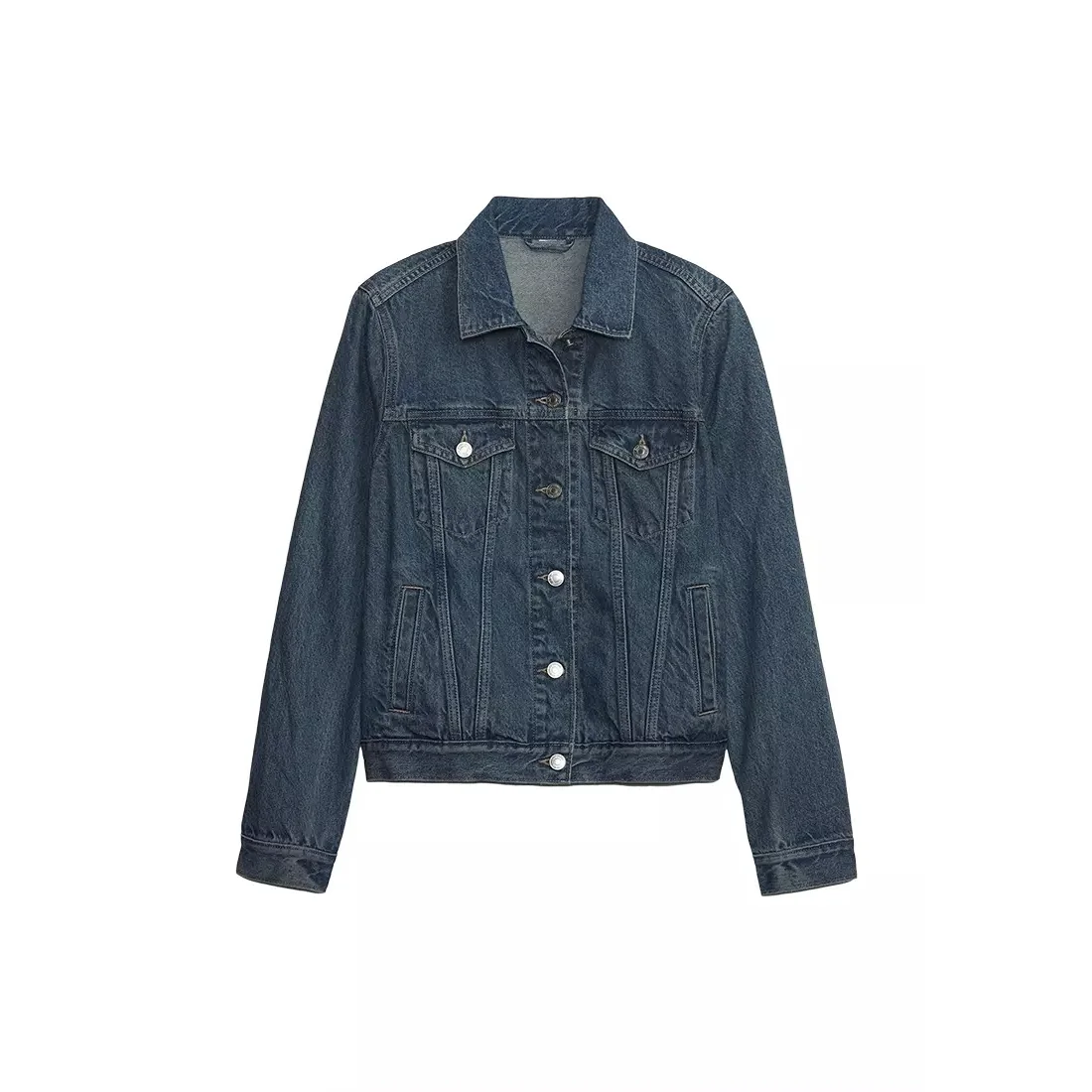 Design: Classic trucker style with button-front closure
